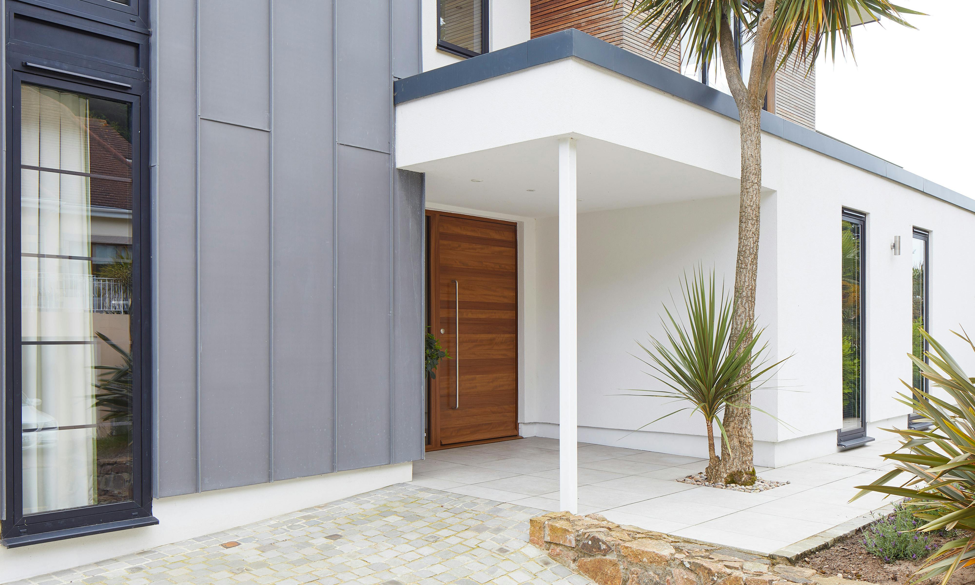 Rendered buildings may still have other finishes on a small section of the frontage, like cladding, stone or zinc. In this case, you’ll need to keep in mind how your front door will also work with these.