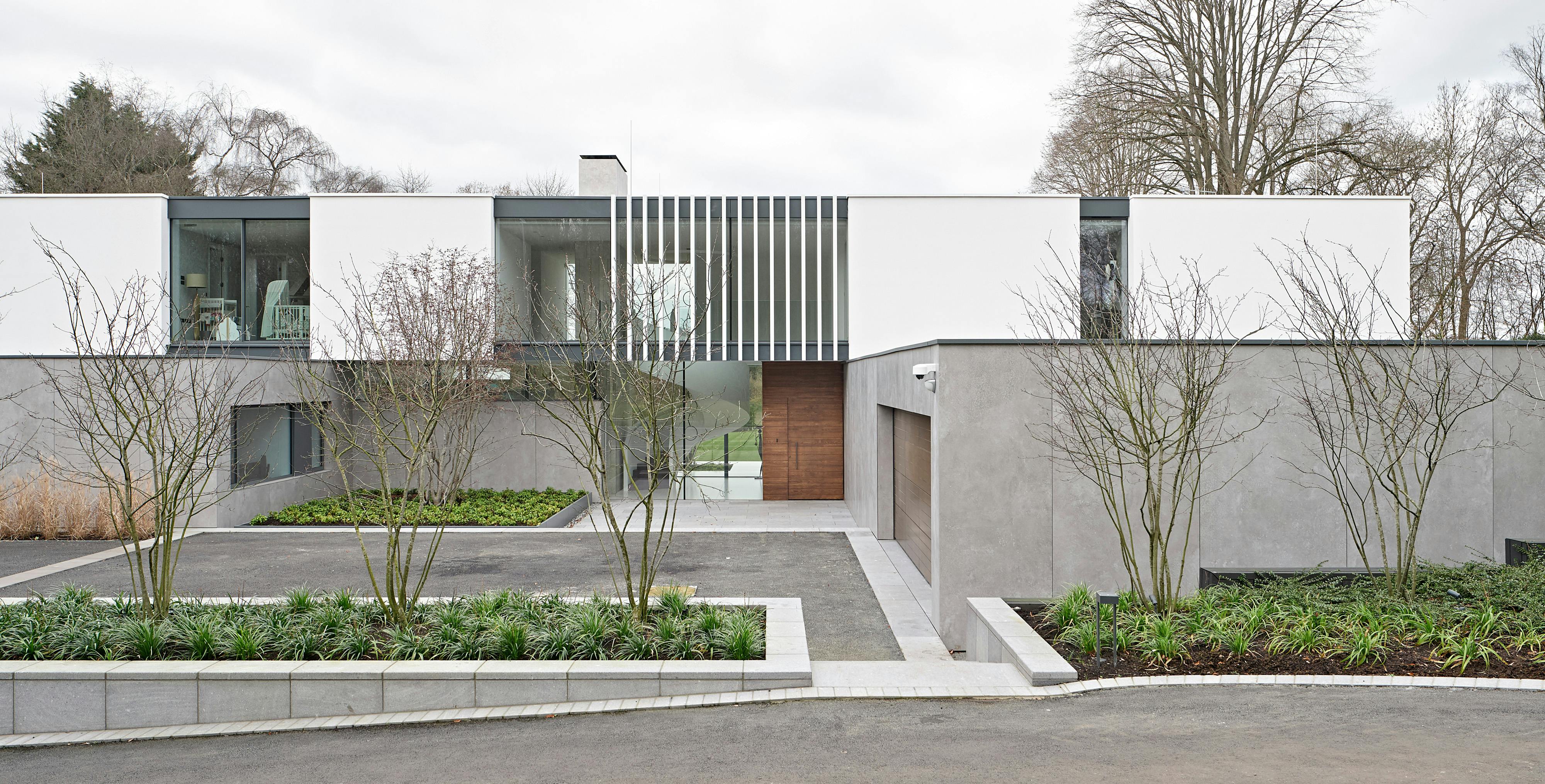 The front door is a very important feature and forms the focal point to the sweeping approach to the house. The rich colour and texture of the door creates a deliberate contrast with the monochrome colour palette of the external walls.