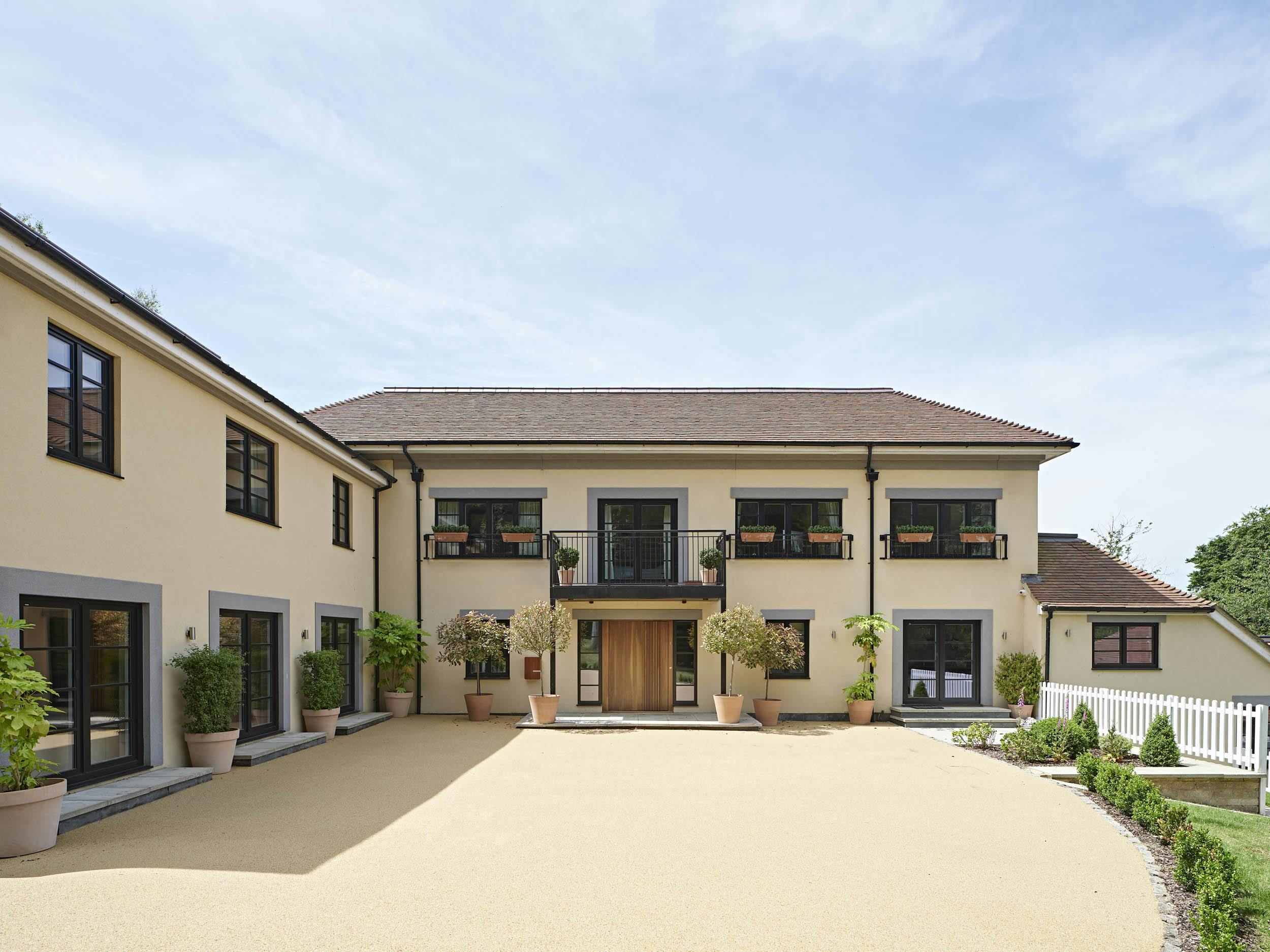 Standing front and centre of this 5-bedroom house is the entrance way, with a stunning dual design and dual coloured front door and a first floor balcony overhead. Outside, our "Bari" door design in warm American black walnut wood exudes a sense of luxury and grandeur. While the inside features our "Milano V" design in a bold painted blue (RAL 5022), creating a surprising but welcoming atmosphere as you step into the home.