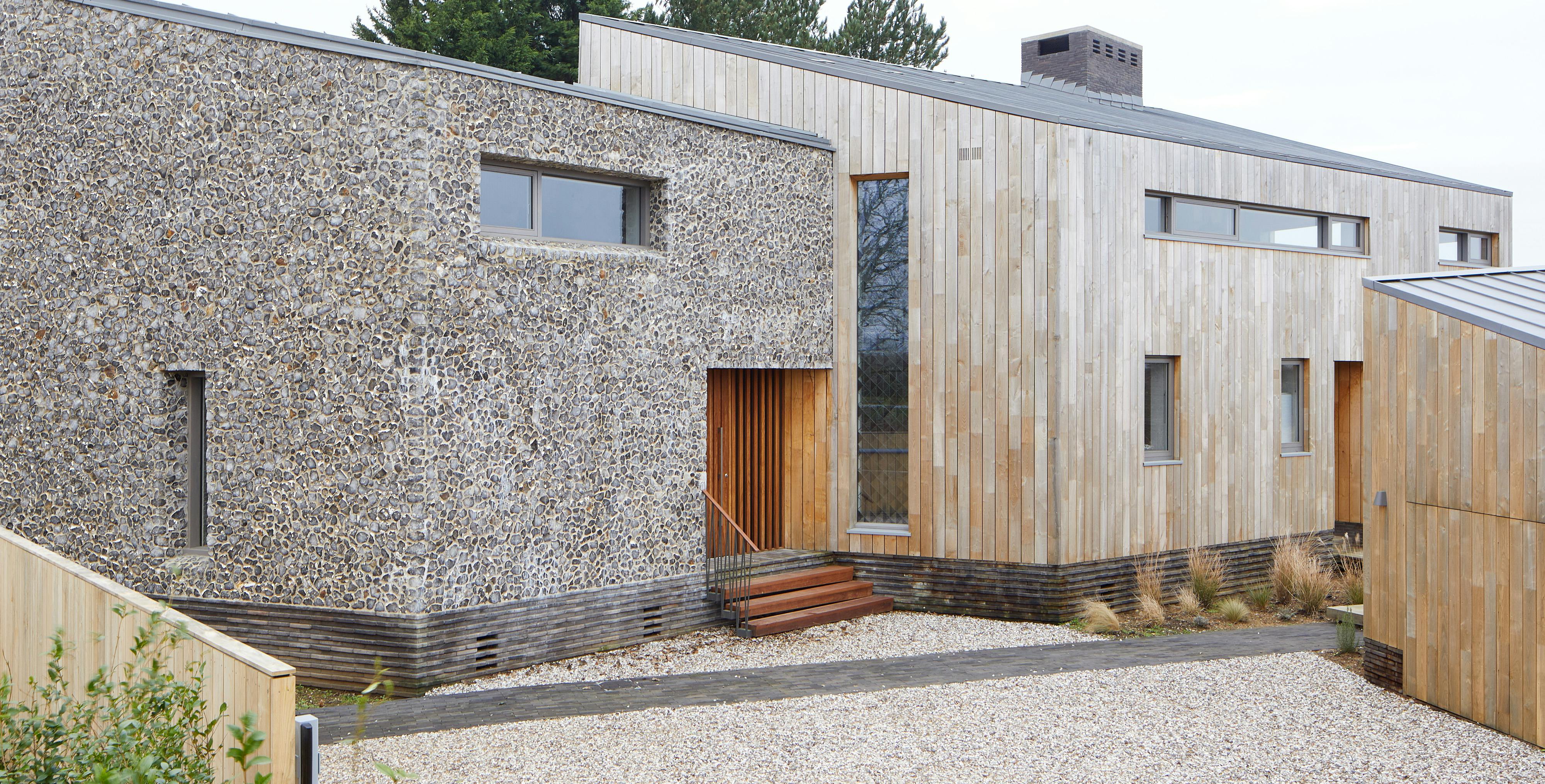 SE: The luxurious oiled Iroko finish of the door was deliberately chosen to contrast with the muted, softer tones of the flint and sweet chestnut. The external architectural forms of the building were designed to be simple and legible in two wedge shapes: the larger element clad in sweet chestnut vertical boarding which will weather to a dark silver grey over time; and the smaller form was clad in locally sourced dark grey knapped flint. We wanted the front door to be a statement feature, which stood out from the rest of the building in its colour and texture.