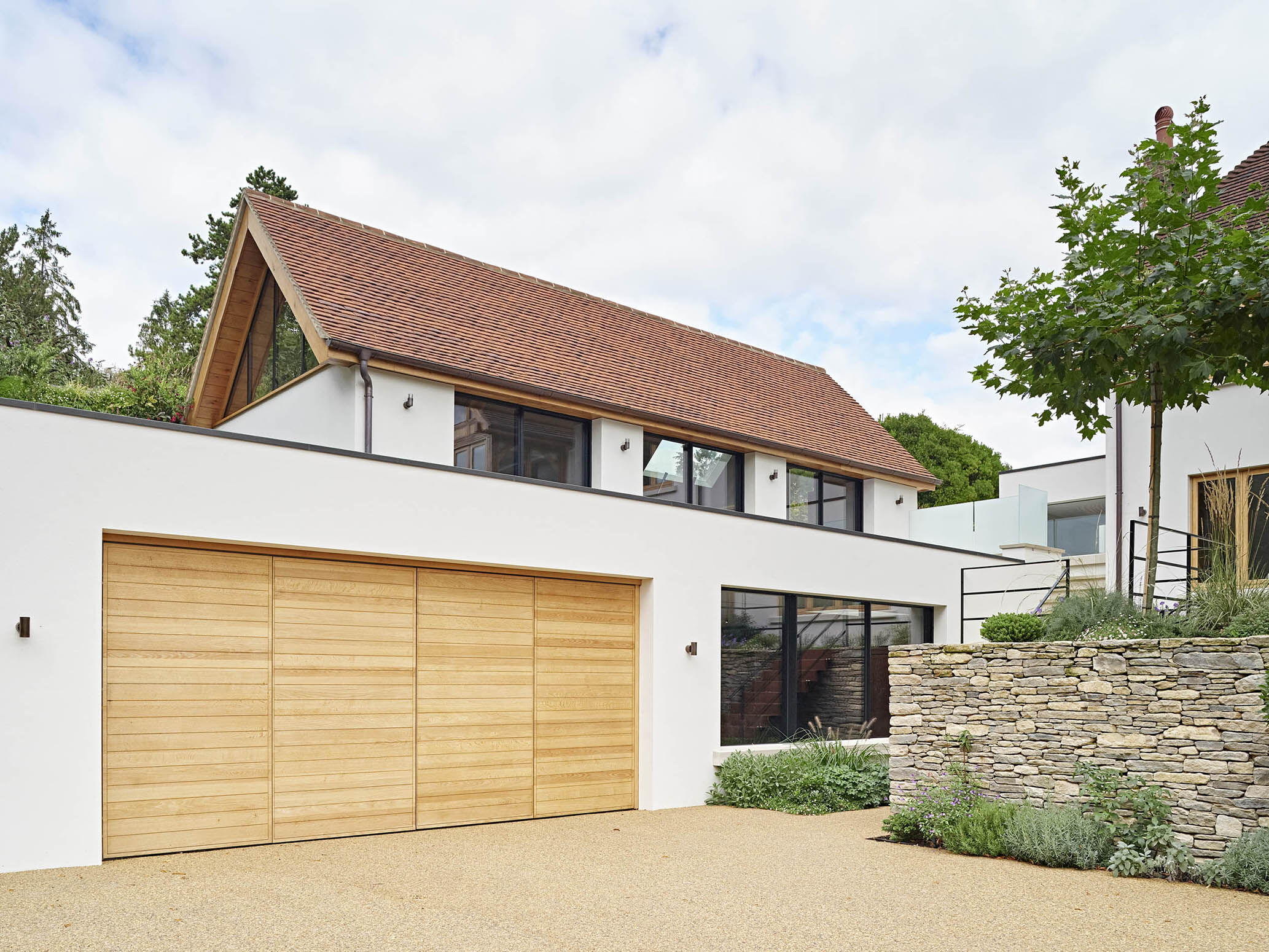 The garage wall frames and enhances the courtyard feel. For me the beauty is in the simplicity of the oak garage door against the white render.