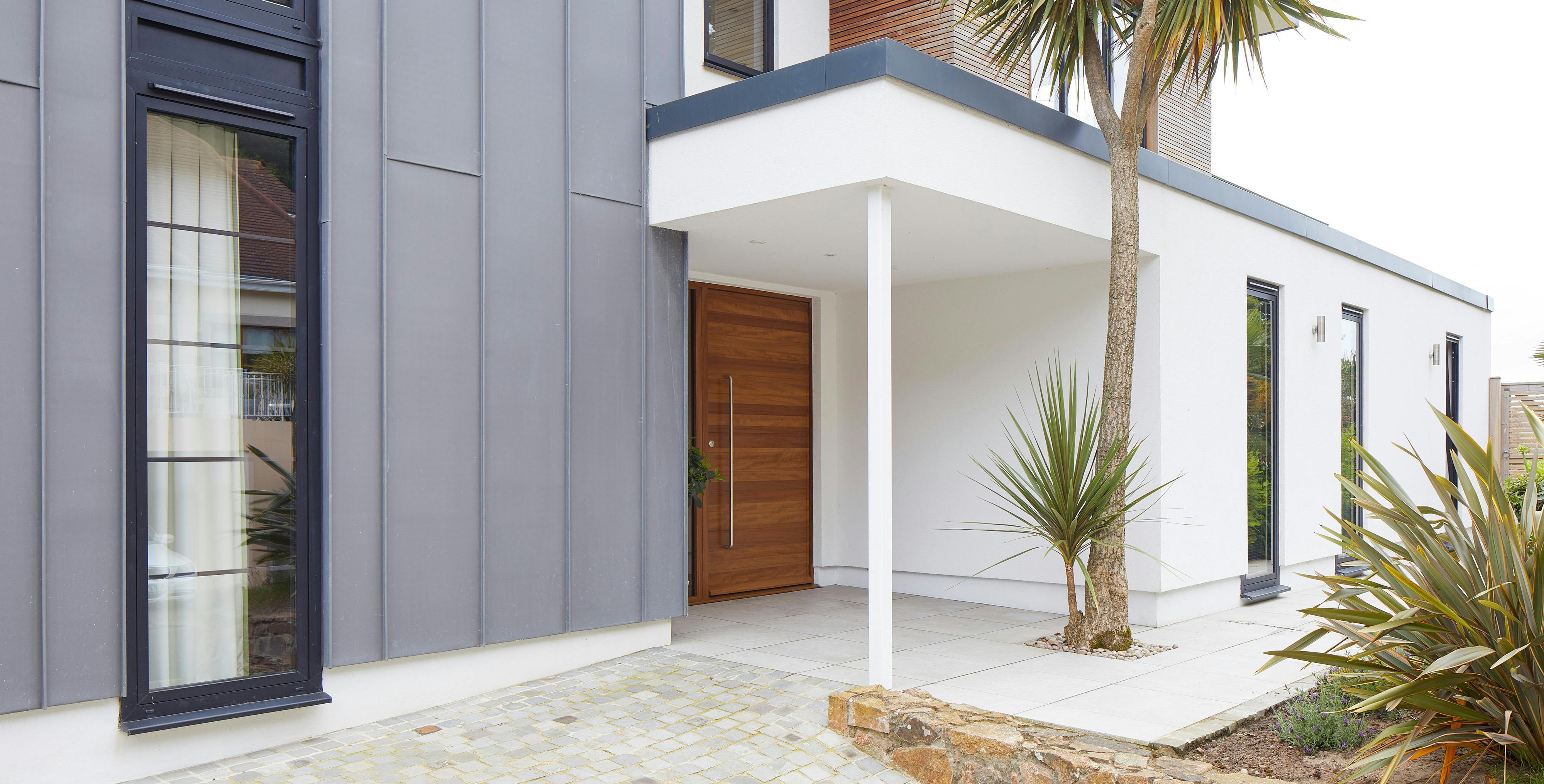 Rendered buildings may still have other finishes on a small section of the frontage, like cladding, stone or zinc. In this case, you’ll need to keep in mind how your front door will also work with these.