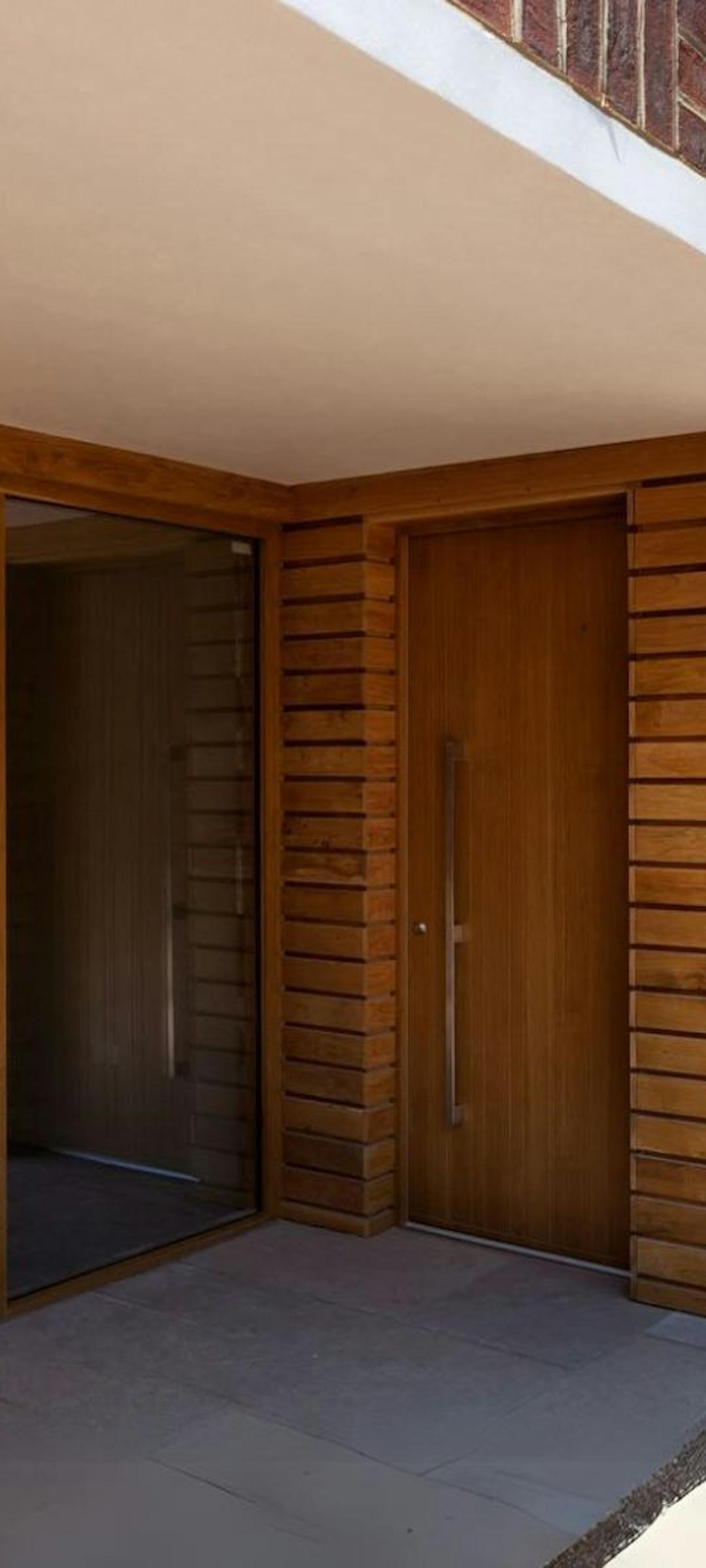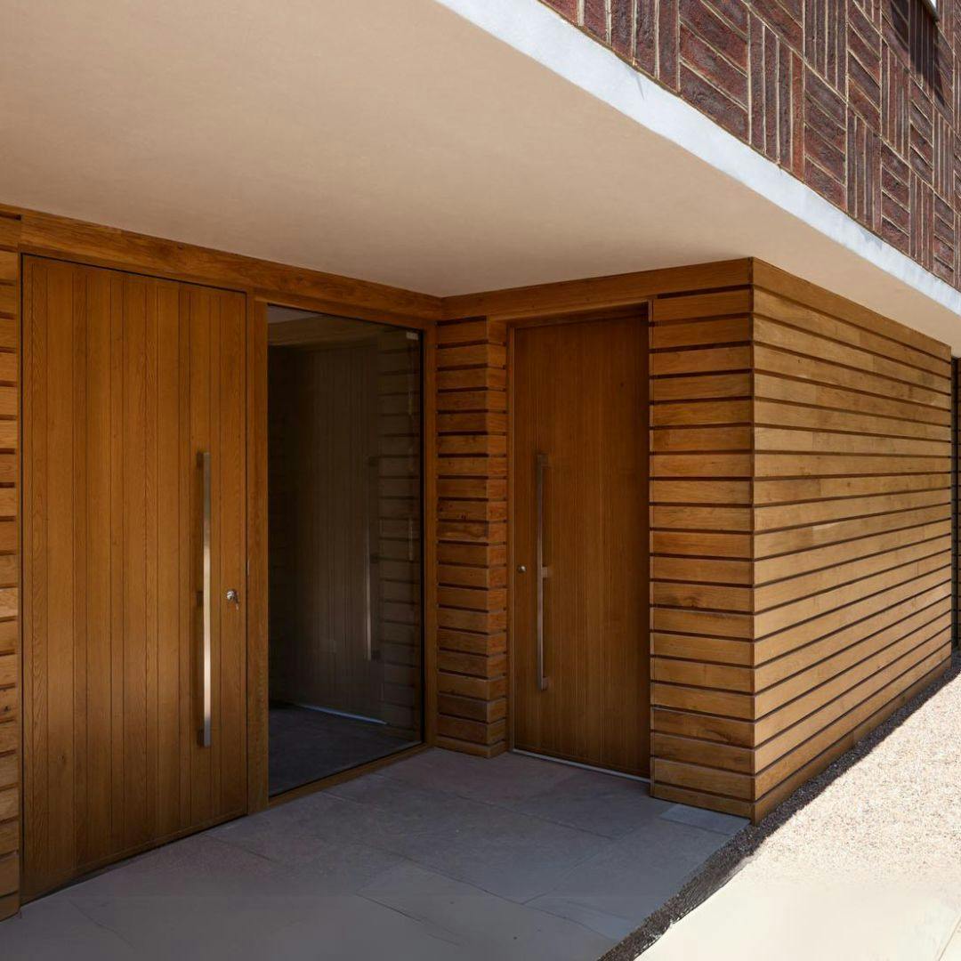 You don’t have to match the doors in colour and finish. For instance, you could have the front door in hardwood and the secondary door in the same colour as the windows. Looking at our examples, however, most clients choose the same finish but different designs for their external doors. If both your doors have the same finish, make sure your front door has a bigger and/or different handle and larger sidelights to make it stand out.