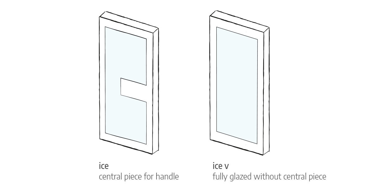 The "Ice" was designed to maximise light and was modelled on the shape of a Gucci handbag. The middle section of the design usually holds the handle horizontally, however, with the "Ice V" option the door is fully glazed with no interruption.
